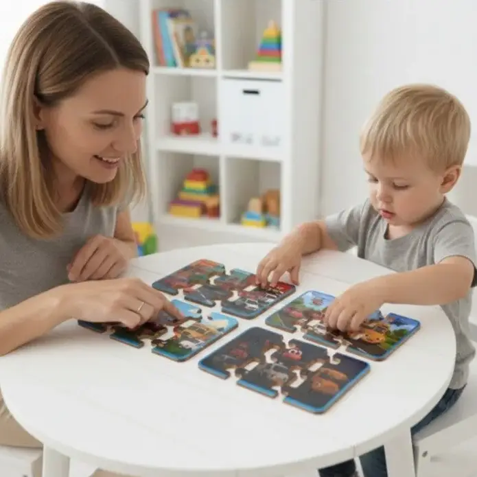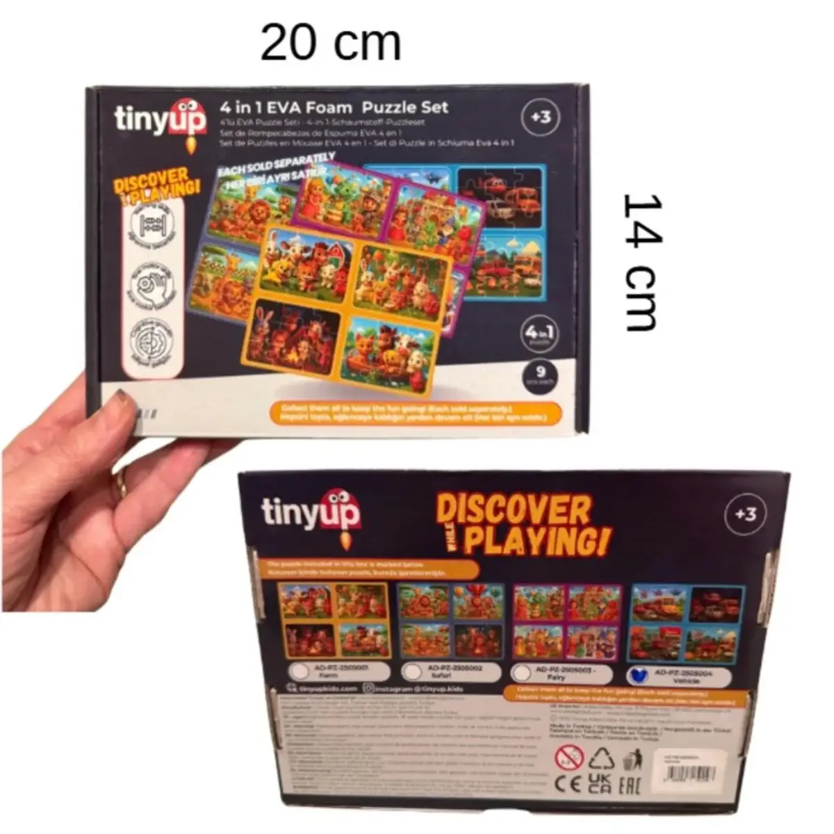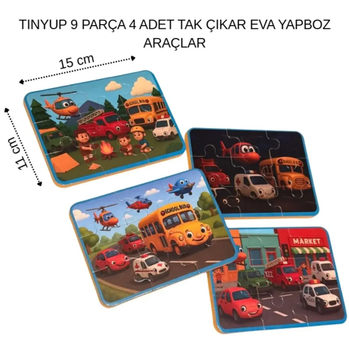 4 in 1 EVA Foam Puzzle Set – Arabalar, 3 yaş ve üzeri çocuklar için tasarlanmış eğitici ve eğlenceli bir puzzle setidir. Renkli ve sevimli araçlar teması sayesinde çocukların ilgisini çekerken, her biri 9 parçadan oluşan 4 farklı puzzle ile keyifli ve öğretici bir oyun deneyimi sunar. Yumuşak ve hafif EVA foam malzemeden üretilen puzzle parçaları, çocukların güvenle oynamasına olanak tanır. Bu set; el-göz koordinasyonu, dikkat gelişimi ve problem çözme becerilerinin desteklenmesine yardımcı olur ve okul öncesi dönem için ideal bir oyuncaktır.