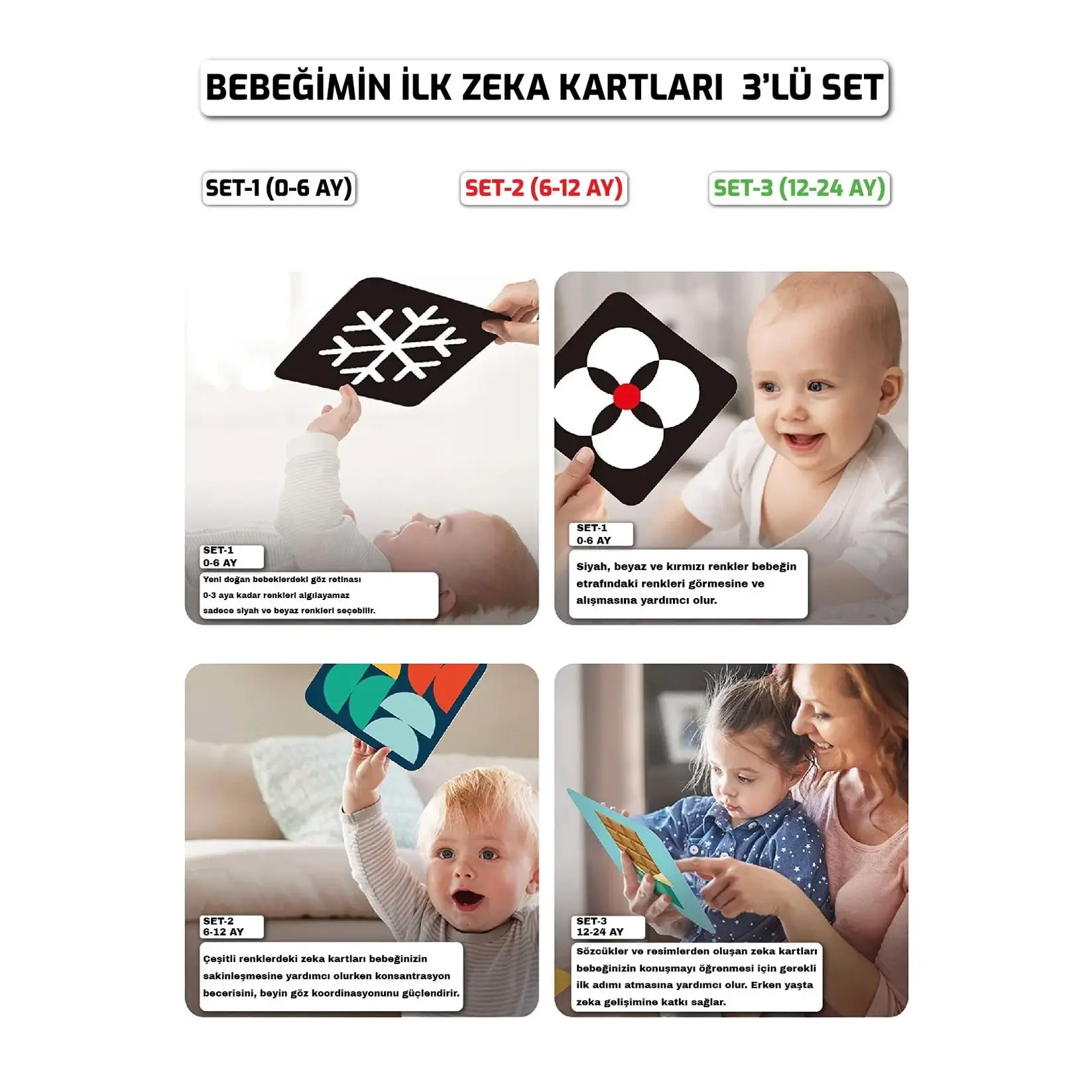 Bebeğimin İlk Zeka Kartları 3’lü Set, 0–24 ay arası bebeklerin gelişim dönemlerine uygun olarak tasarlanmış, algı ve öğrenme becerilerini destekleyen eğitici kartlardan oluşur. Siyah-beyazdan renkliye doğru ilerleyen yapısı sayesinde görsel algı, dikkat ve erken öğrenme becerilerinin adım adım gelişimine katkı sağlar. Yaş gruplarına ayrılmış içeriğiyle ebeveynler için güvenli ve verimli bir öğrenme süreci sunar.
