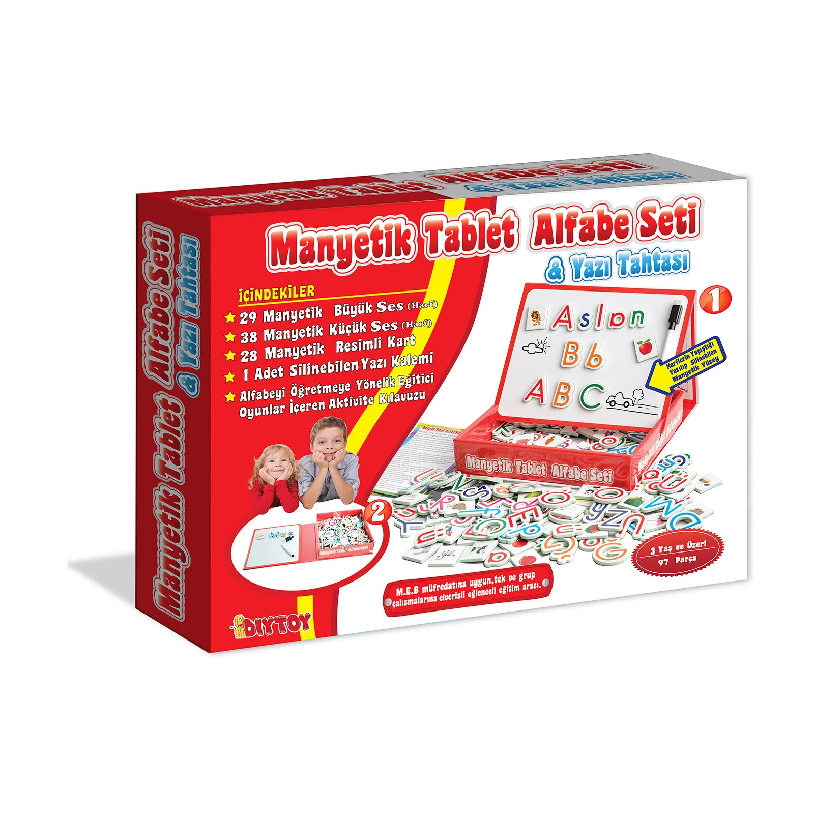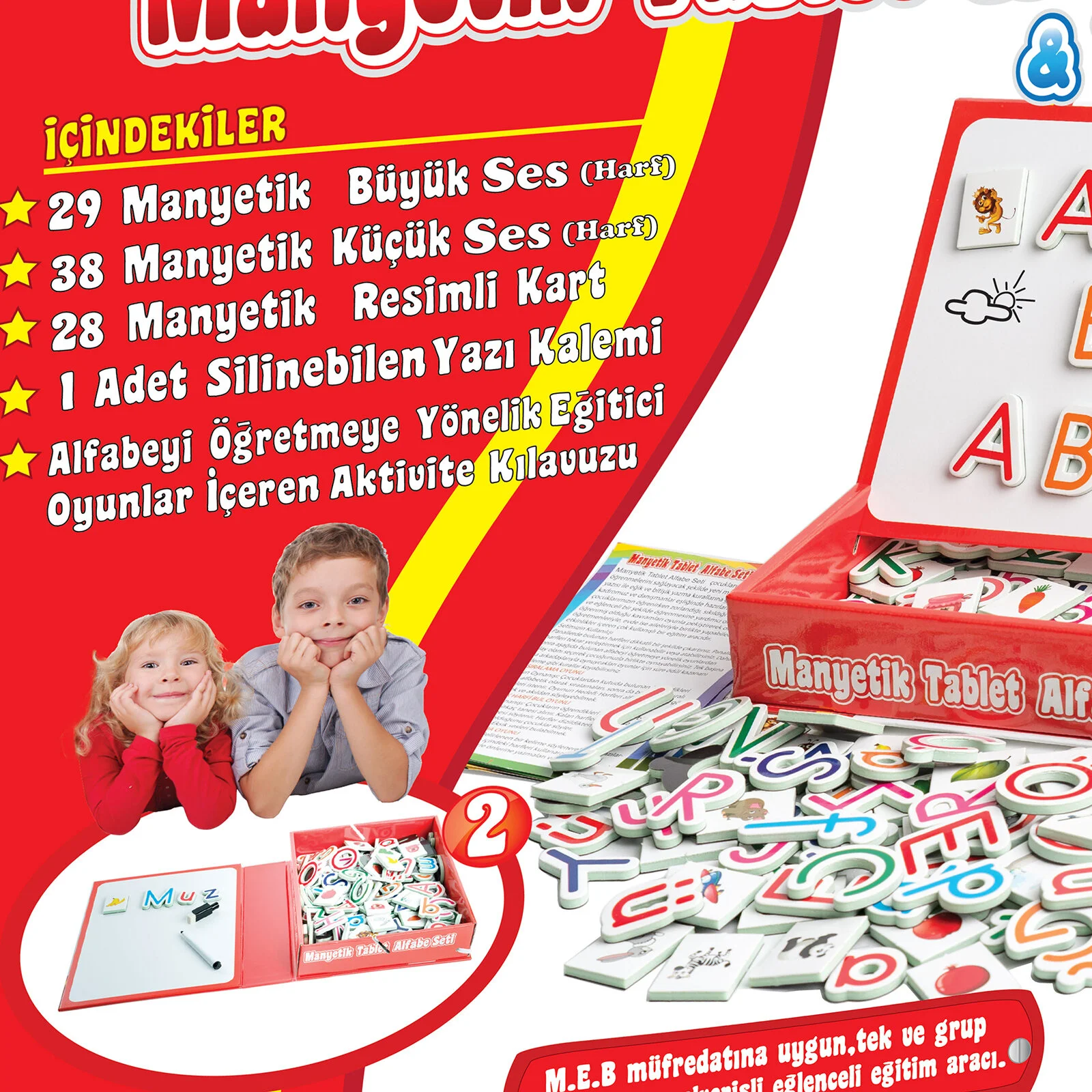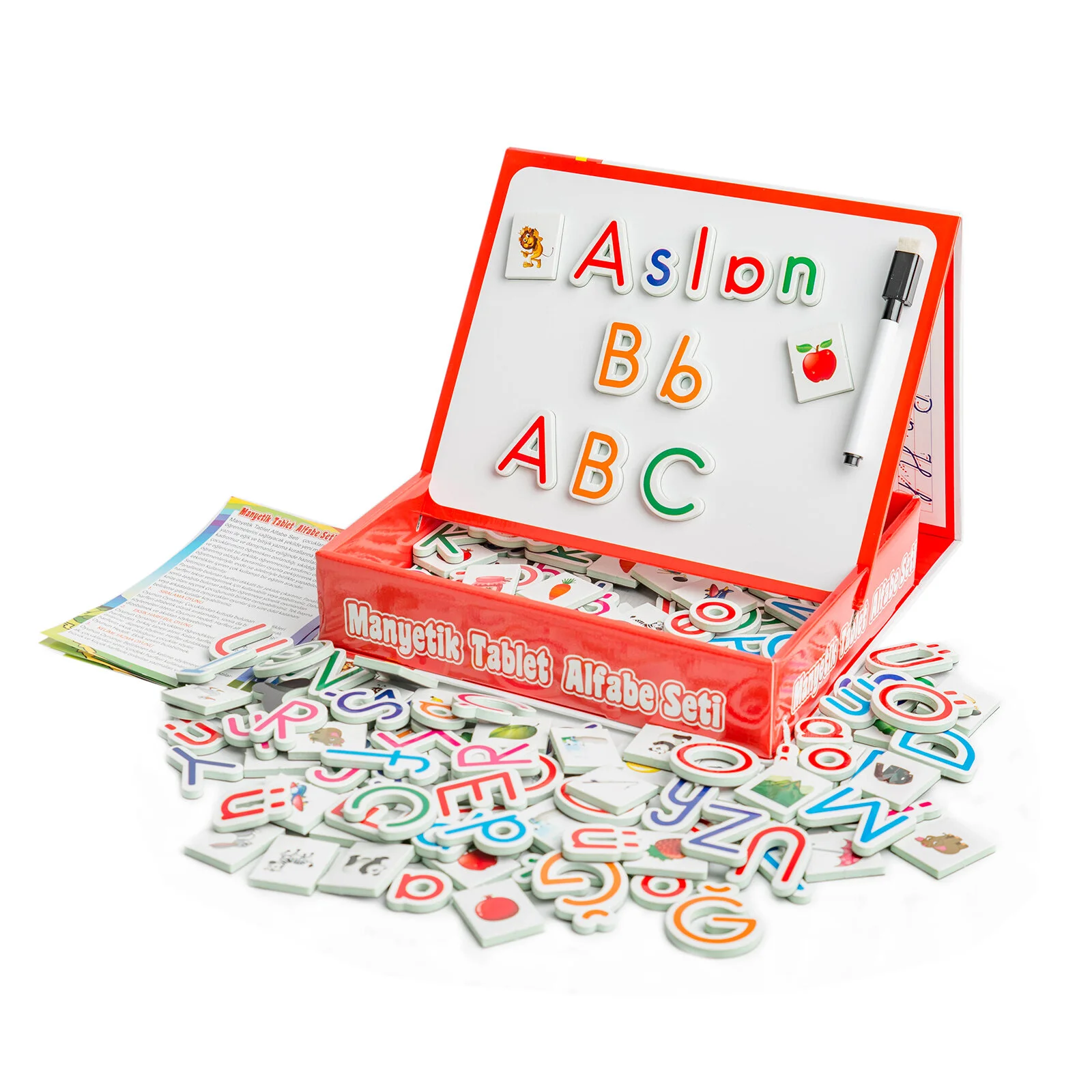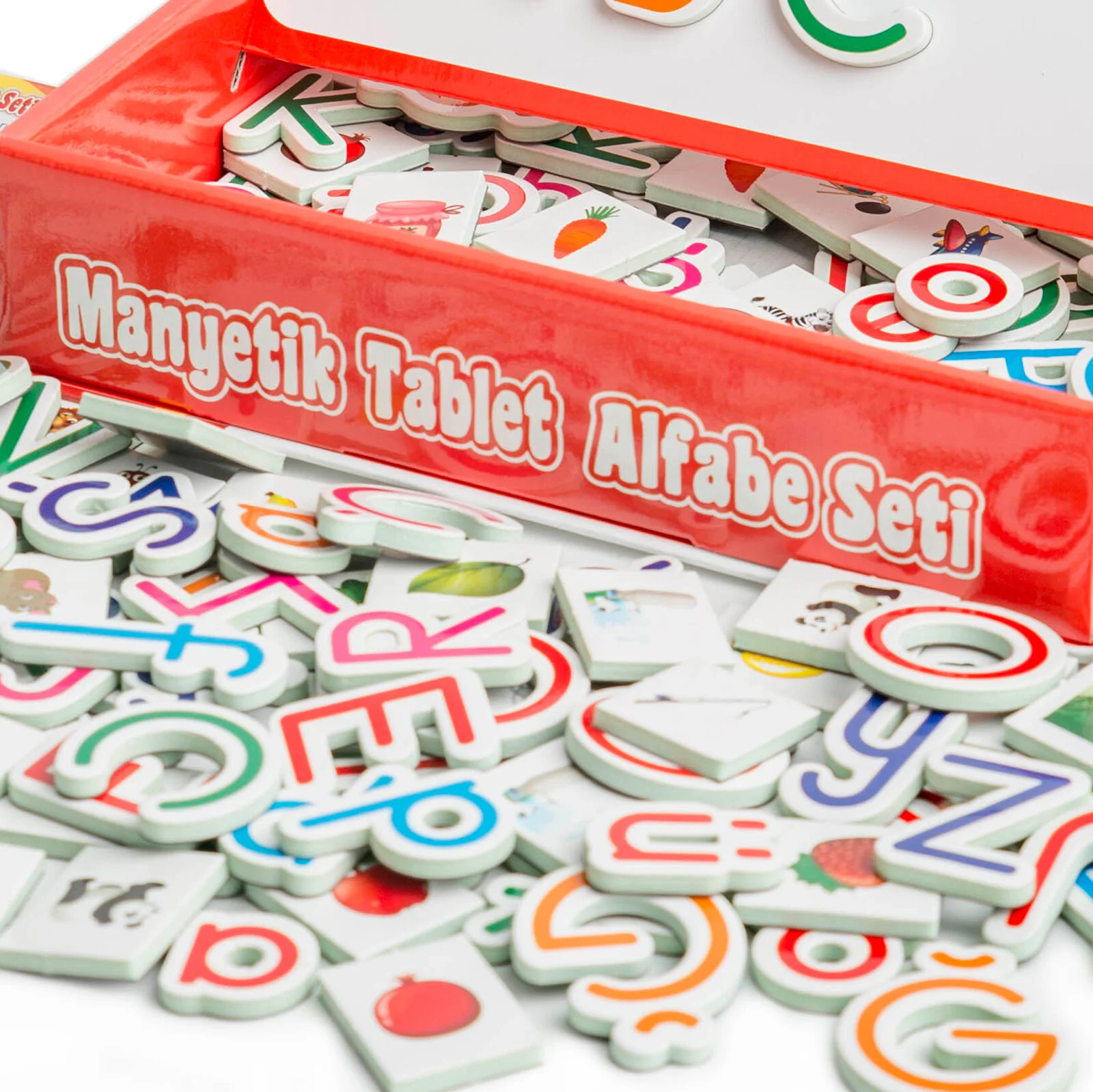 Manyetik Tablet Alfabe Seti, çocukların harfleri, rakamları ve temel kelimeleri eğlenerek öğrenmesini sağlayan çok yönlü bir eğitici oyuncaktır. Manyetik alfabe ve rakam parçaları tablet üzerine kolayca yerleştirilebilir; yazı tahtası sayesinde çocuklar yazı yazma ve çizim çalışmaları yapabilir. Öğrenmeyi oyunla birleştirir.